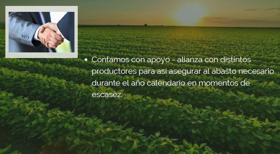 Tenemos alimentos seleccionados para facilitar la operación diaria de negocios, de comida, entrega de producto fresco, de cosecha diaria, con disponibilidad todo el año gracias a cultivos en diferentes regiones del país.